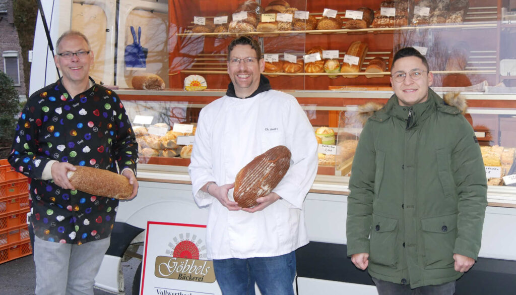 Neu auf dem Schaager Wochenmarkt (von links): Bäcker- und Konditormeister Markus Jansen, Christian Andre (Verkaufsleiter Außenvertrieb) und Gil Mirana (Citymanager Stadt Nettetal). Foto: Stadt Nettetal