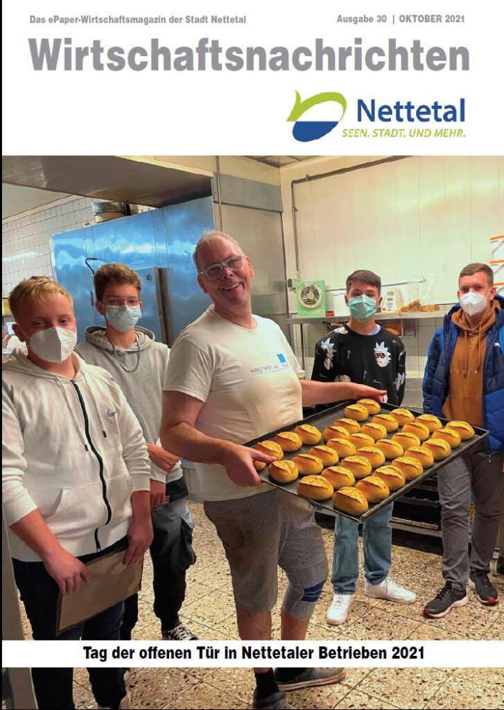 Nettetal (red) 20. Oktober 2021 Der diesjährige „Tag der offenen Tür in Nettetaler Betrieben“ steht im Mittelpunkt der neuen Wirtschaftsnachrichten Nettetal. Außerdem informiert die Wirtschaftsförderung auf zwölf Seiten über rekordverdächtiges BRATA-Paniermehl aus Breyell, die neue MEINS-Gewerbeimmobilie im Energieeffizienzstandard 40 EE, das 125-jährige Bestehen der Baugesellschaft Nettetal sowie mehrere Neueröffnungen in der Seenstadt. Die 30. Ausgabe ist jetzt als ePaper an die Unternehmen verschickt worden.